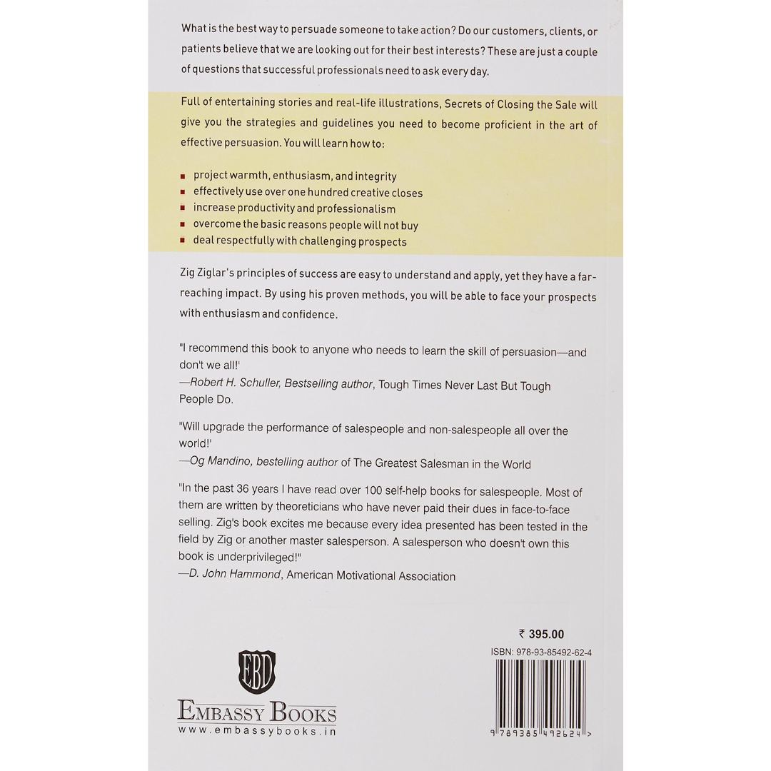 What is the best way to persuade someone to take action? Do our customers, clients, or patients believe that we are looking out for their best interests? These are just a couple of questions that successful professionals need to ask every day.Full of entertaining stories and real-life illustrations, Secrets of Closing the Sale will give you the strategies and guidelines you need to become proficient in the art of effective persuasion. You will learn how to: project warmth, enthusiasm, and integrity effectively use over one hundred creative closes increase productivity and professionalism overcome the basic reasons people will not buy deal respectfully with challenging prospects Zig Ziglar’s principles of success are easy to understand and apply, yet they have a far-reaching impact. By using his proven methods, you will be able to face your prospects with enthusiasm and confidence. “In the past 36 years I have read over 100 self-help books for salespeople. Most of them are written by theoreticians who have never paid their dues in face-to-face selling. Zig’s book excites me because every idea presented has been tested in the field by Zig or another master salesperson. A salesperson who doesn’t own this book is underprivileged!” —D. John Hammond, American Motivational Association.