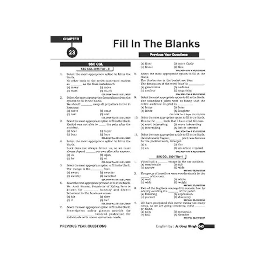 Master English grammar comprehensively with this bilingual guide designed specifically for competitive exam preparation. This first edition covers all essential topics from basic grammar to advanced concepts, featuring detailed explanations and examples across 24 well-structured chapters. The book includes extensive practice material with topic-wise spotting errors, fill-in-the-blanks, and sentence improvements. It contains previous year questions from various exams including SSC CGL, CPO, CHSL, MTS, CDS, and more, updated till January 2025. What sets this book apart is its systematic approach to learning, with mixed practice sections and the latest TCS questions asked in SSC exams. Perfect for aspirants preparing for government recruitment exams, this guide offers thorough coverage of grammatical concepts with practical applications. Comes with exclusive video content accessible through a special coupon code inside.