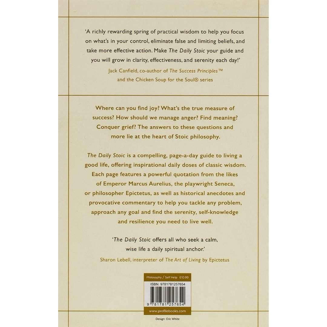 The Sunday Times Bestseller,A generous gift of guidance on modern living culled from a canon of wisdom hatched long ago.’ – Maria Popova, editor of Brain Pickings .’A richly rewarding spring of practical wisdom to help you focus on what’s in your control, eliminate false and limiting beliefs, and take more effective action.’ Jack Canfield, co-author of The Success Principle and the Chicken Soup for the Soul® series.Daily doses of practical, uplifting philosophy from the bestselling author of .The Obstacle is the Way,Where can you find joy? What’s the true measure of success? How should we manage anger? Find meaning? Conquer grief? The answers to these questions and more lie at the heart of Stoic philosophy.The Daily Stoic is a wise, calming, page-a-day guide to living a good life, offering inspirational daily doses of classic wisdom. Each page features a powerful quotation from the likes of Emperor Marcus Aurelius, the playwright Seneca, or philosopher Epictetus, as well as historical anecdotes and thought-provoking commentary to help you tackle any problem, approach any goal and find the serenity, self-knowledge and resilience you need to live well.