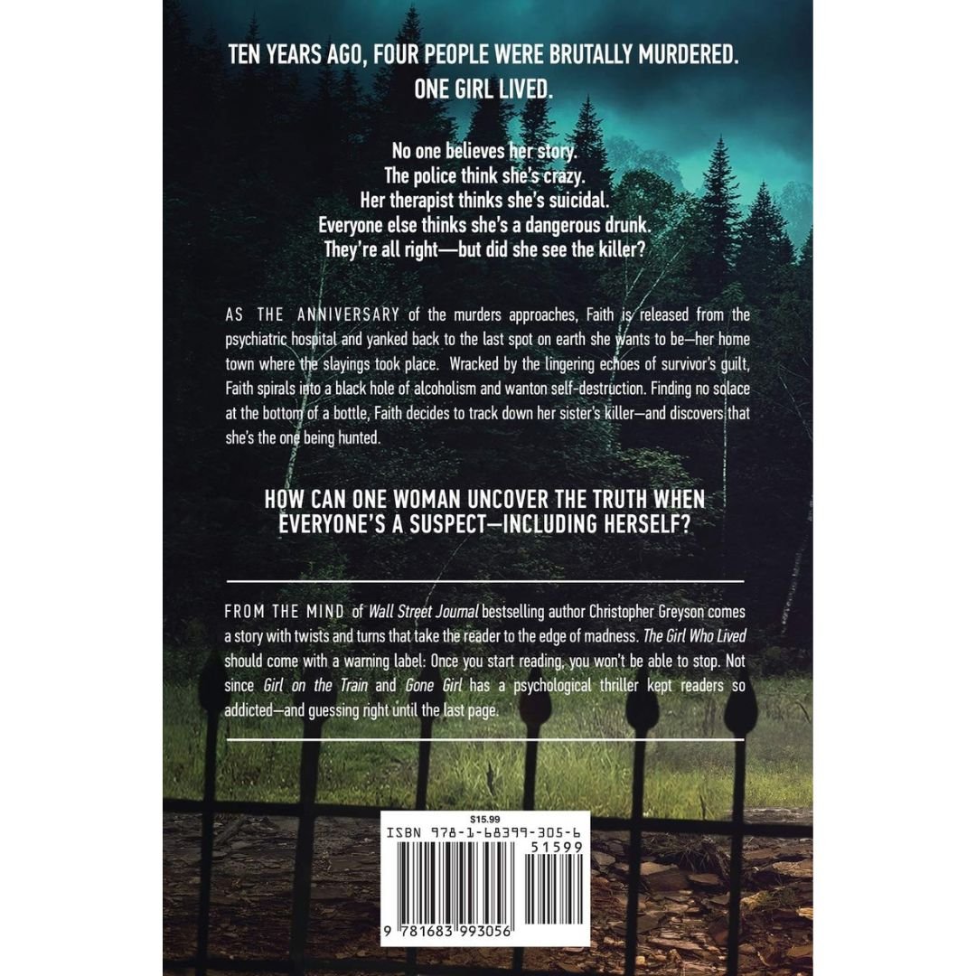 Ten years ago, four people were brutally murdered. One girl lived. No one believes her story. The police think she’s crazy. Her therapist thinks she’s suicidal. Everyone else thinks she’s a dangerous drunk. They’re all right–but did she see the killer? As the anniversary of the murders approaches, Faith Winters is released from the psychiatric hospital and yanked back to the last spot on earth she wants to be–her hometown where the slayings took place. Wracked by the lingering echoes of survivor’s guilt, Faith spirals into a black hole of alcoholism and wanton self-destruction. Finding no solace at the bottom of a bottle, Faith decides to track down her sister’s killer–and then discovers that she’s the one being hunted. How can one woman uncover the truth when everyone’s a suspect–including herself?