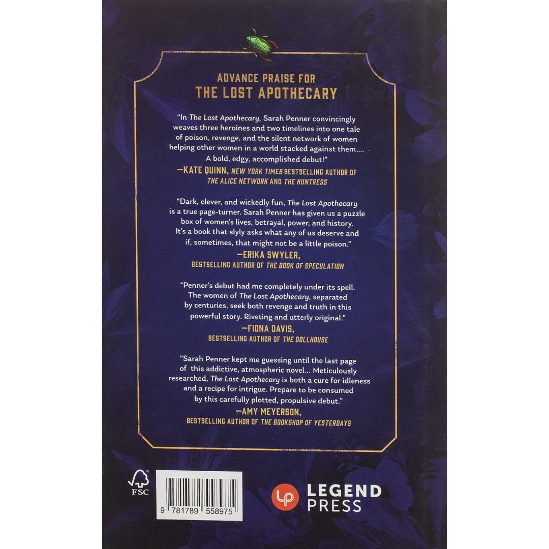 Hidden in the depths of eighteenth-century London, a secret apothecary shop caters to an unusual kind of clientele. Women across the city whisper of a mysterious figure named Nella who sells well-disguised poisons to use against the oppressive men in their lives. But the apothecary s fate is jeopardized when her newest patron, a precocious twelve-year-old, makes a fatal mistake, sparking a string of consequences that echo through the centuries.Meanwhile in present-day London, aspiring historian Caroline Parcewell spends her tenth wedding anniversary alone, running from her own demons. When she stumbles upon a clue to the unsolved apothecary murders that haunted London two hundred years ago, her life collides with the apothecary s in a stunning twist of fate and not everyone will survive.With crackling suspense, unforgettable characters and searing insight, The Lost Apothecary is a subversive and intoxicating debut novel of secrets, vengeance and the remarkable ways women can save each other despite the barrier of time.2021’s Most Highly Anticipated New Books NewsweekMost Anticipated Books of 2021 Popsugar’A bold, edgy, accomplished debut!’ Kate Quinn, New York Times bestselling author of The Alice Network and The Huntress’Intriguing Readers who enjoy parallel historical/contemporary narratives about women s lives, such as Claire McMillan s The Necklace or Liz Trenow s The Forgotten Seamstress, will enjoy the historical details and mystery in this engrossing tale.’ Library Journal.